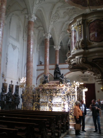 In fact, as Maximilian died on the way to Vienna and his body was taken there instead, he isn’t buried in the tomb at all – it’s empty. As you can see, though, it’s still rather grand. Not quite as grand, however, as the Jakobsdom, or cathedral of St. James, just around the corner but built over 200 years later. When I went in, there were only a handful of people in there, at the front, kneeling and chanting prayers to their Catholic God. I found this slightly sinister; I can’t argue with their right to worhsip as they choose, but I wonder if they are making these noises in the interests of peace, or of tribalism? I can’t help it, but everywhere I go here I remember the Jews…