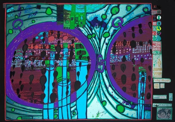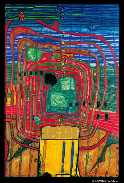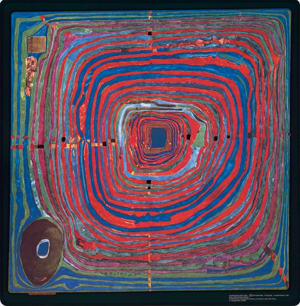 That’s what Hundertwasser said. He was an originally Viennese but ultimately globetrotting artist originally named Friedrich Stowasser, who ultimately renamed himself Friedenreich Hundertwasser (which is German for peacecountry hundredwater). You can see why he said that about the straight line when you look at his pictures, like Der Grosse Weg (which means the big road), from 1955: