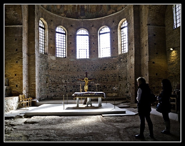 Religious spaces? A little different. Galerius’ intended mausoleum – known as the Rotunda, and converted by Constantine the Great into Thessaloniki’s first state-sanctioned church, frescoed up, then converted by the Ottomans into a mosque with a minaret, and then back again, but now a ward of the state – was open without charge. On the other hand, it was entirely jacked up on the inside with scaffolding, and most of the windows – up high – were shattered.