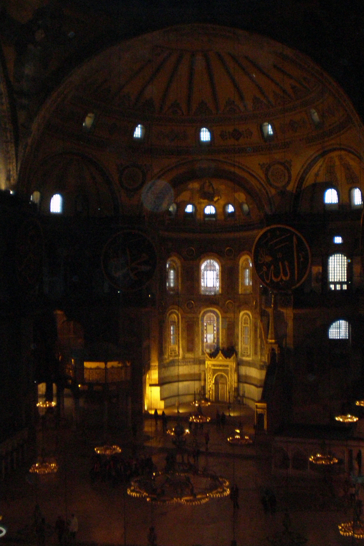 The church – though it is no longer a church, having been for nearly five centuries a mosque, and then sensibly converted by Ataturk into a secular, historical space – is an old lady now; her floors are weathered and crumpled, and in the broad gallery, from rear centre of which the empress used to watch the show, listing like a ship in restless seas. Fragments of the old golden mosaics – many of them battered – remain in places around the walls, in uneasy juxtaposition with the four giant circular lozenges bearing the names of the prophet and his successors in fiery gold on black: